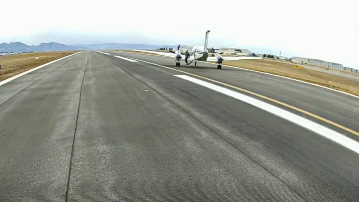 Two people emerged unscathed from the Beechcraft Super King Air 200 after it stopped on the runway at Rocky Mountain Metropolitan Airport near Denver, according to video posted by emergency responders.