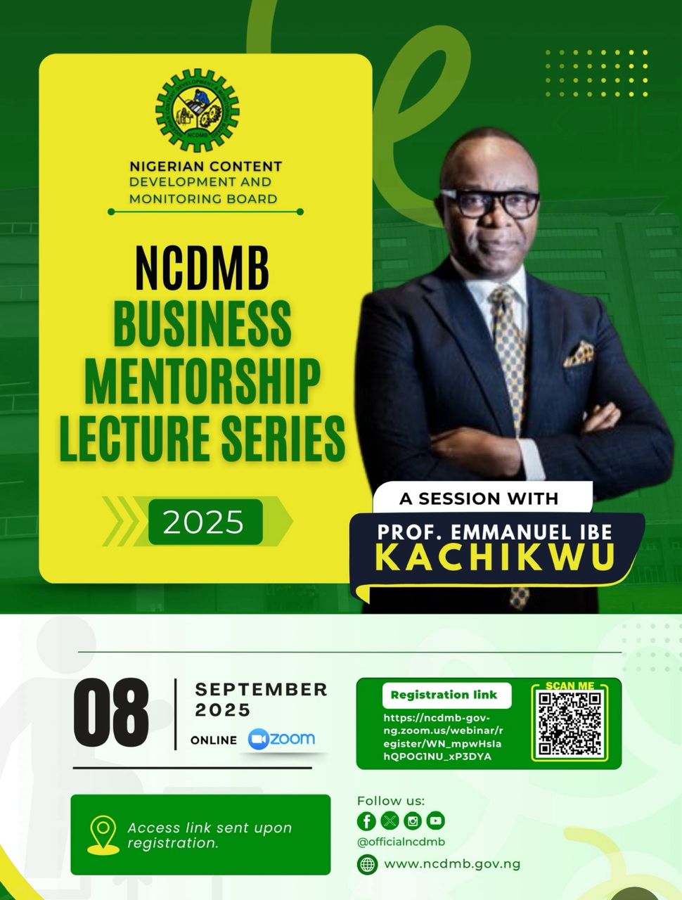 The Nigerian Content Development and Monitoring Board (NCDMB) is delighted to announce that Professor Emmanuel Ibe Kachikwu, former Minister of State for Petroleum Resources, and former chairman of NCDMB’s Governing Council, will serve as the Role Model and Guest Speaker at the NCDMB Business Mentorship Lecture Series (BMLS) for Q3 2025.