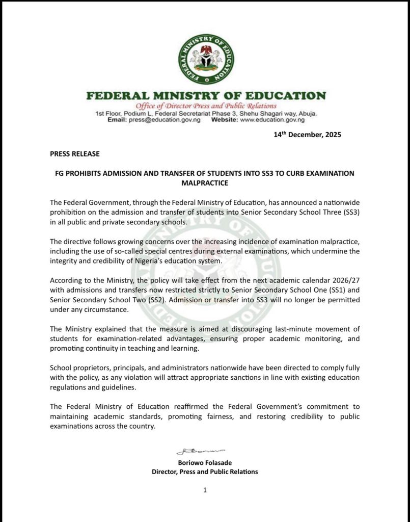 From the 2026/2027 academic session, admissions and transfers will be strictly limited to SS1 and SS2.
