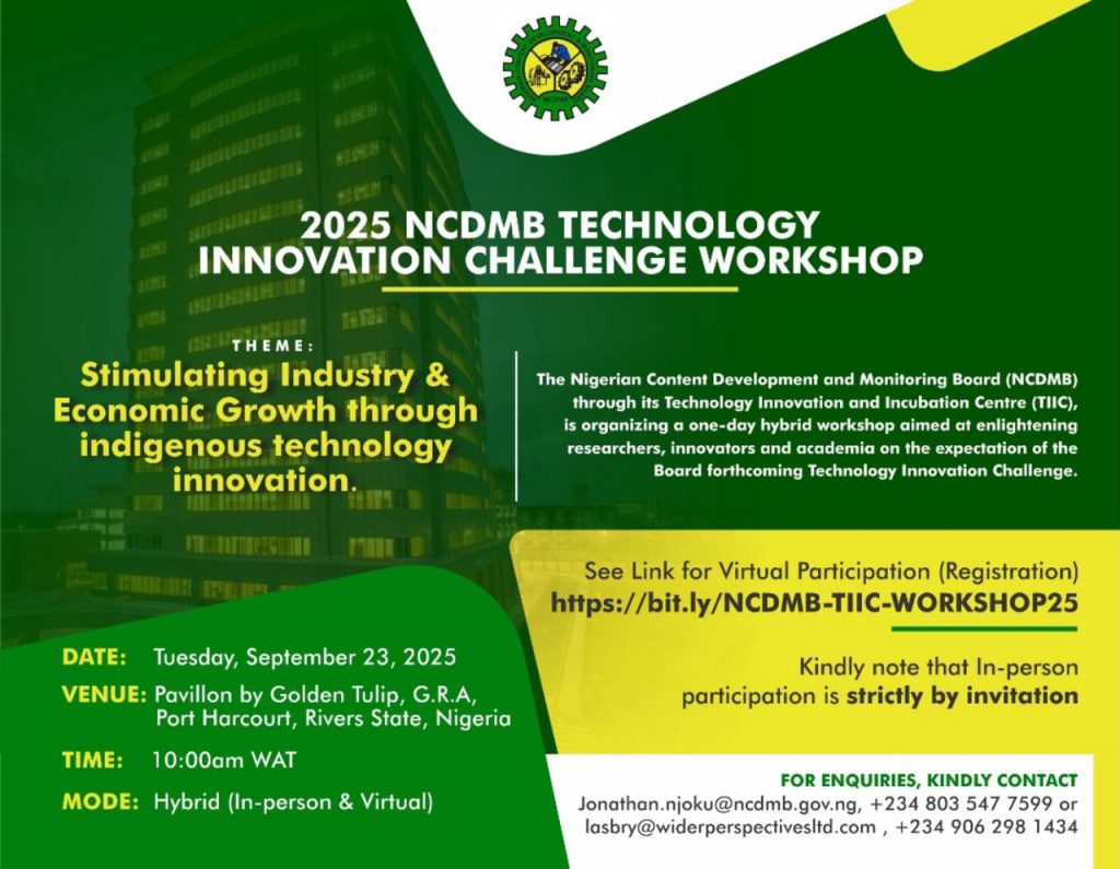 As part of its mandate to drive research and development in Nigeria’s oil and gas sector, the Nigerian Content Development and Monitoring Board (NCDMB) will be hosting a 2025 Technology Innovation Challenge Workshop.